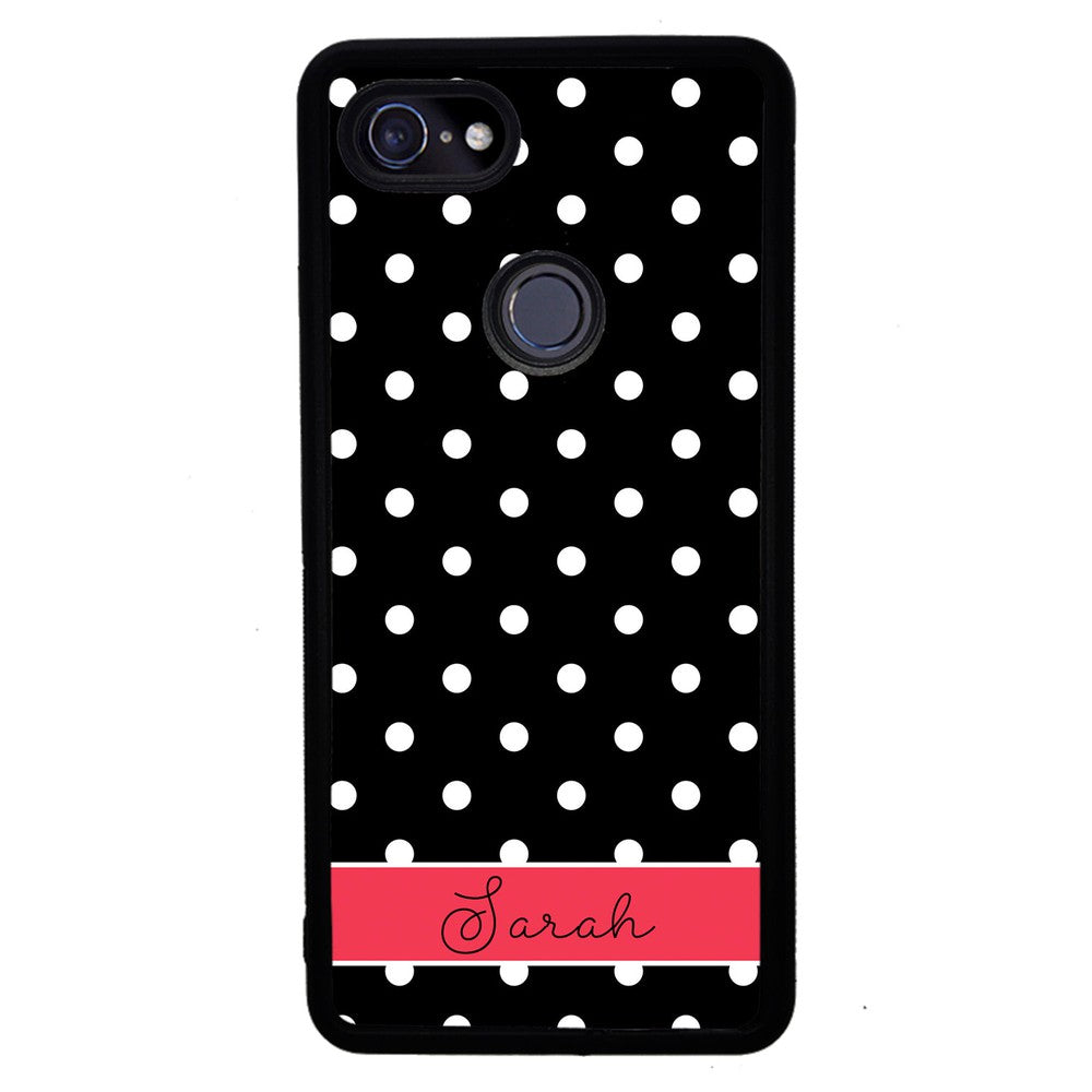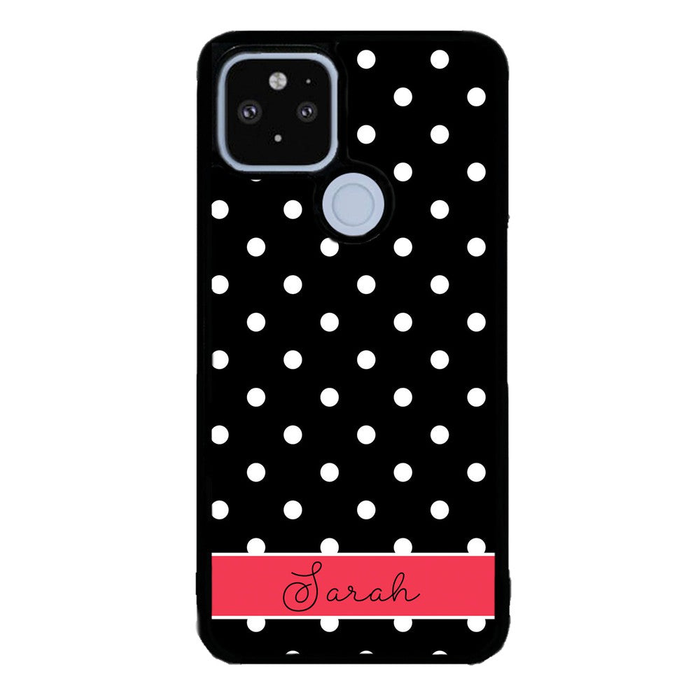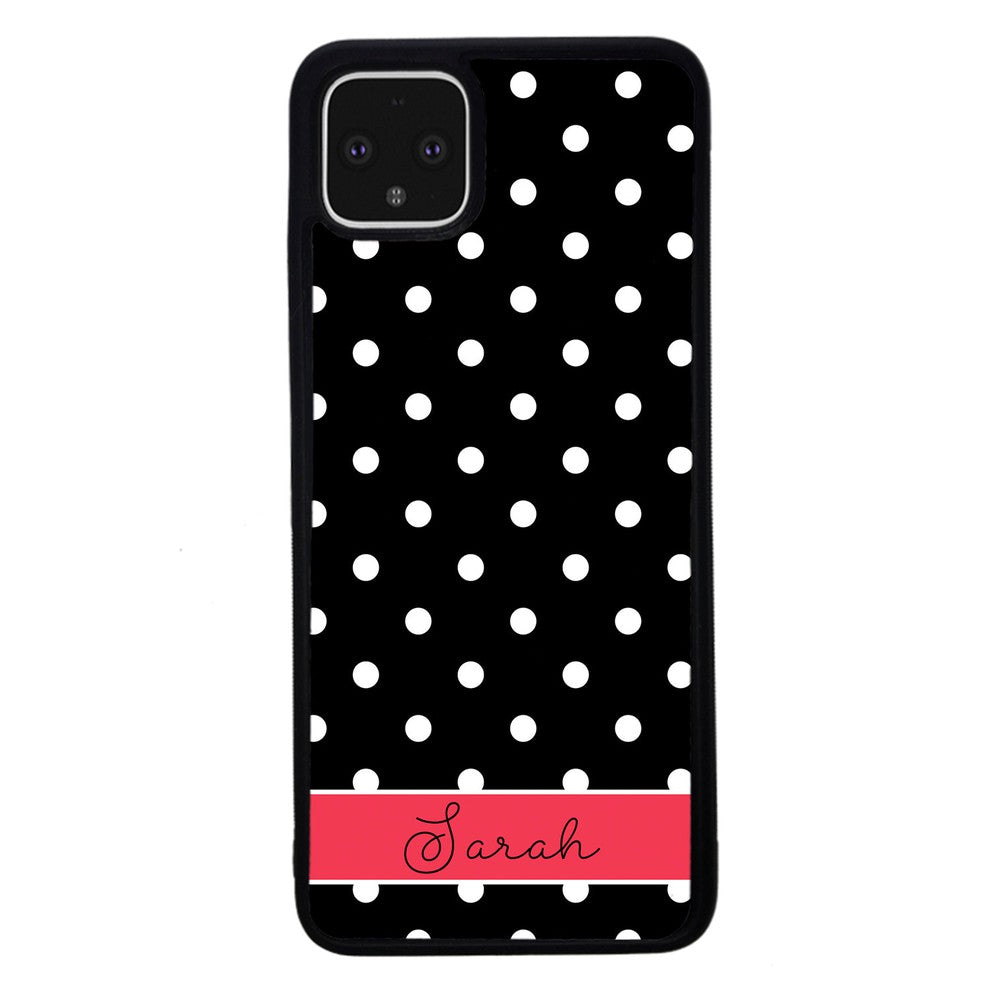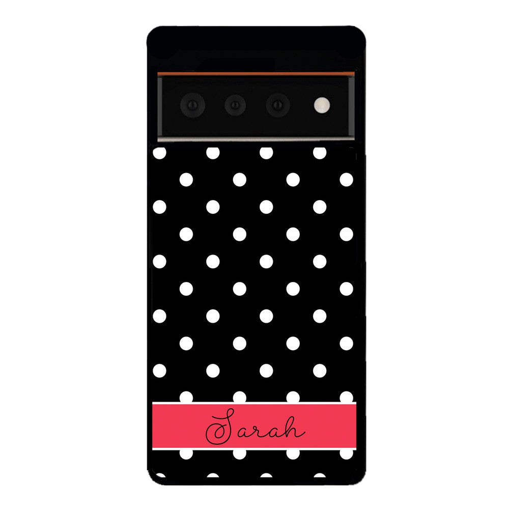 Just a simple black and white polka dot pattern, with a pretty red personalized space to make it your own.