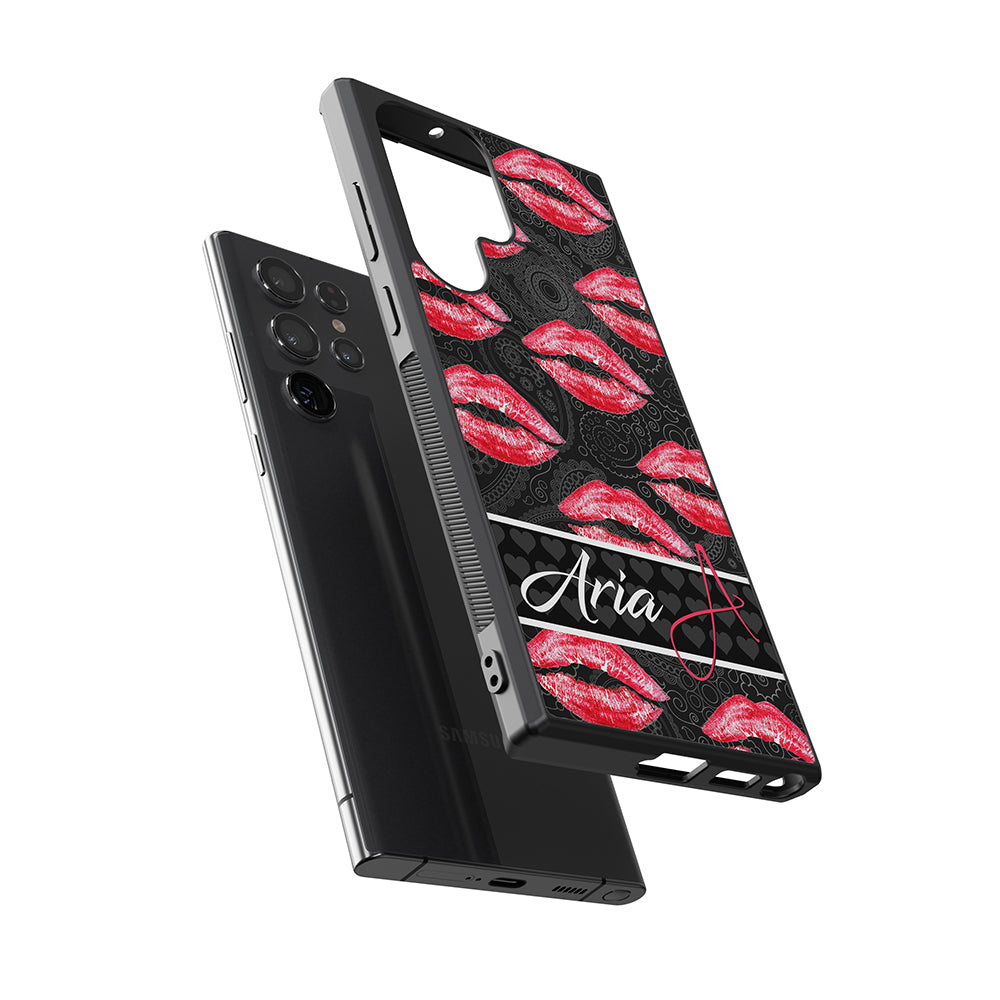 The red lips are a sign of an appeal many cultures fixate upon. They draw our attention to the subject, making their facial features pop. We wanted to take the power red lips, and showcase a fun personalized design that comes together with a french pattern background.